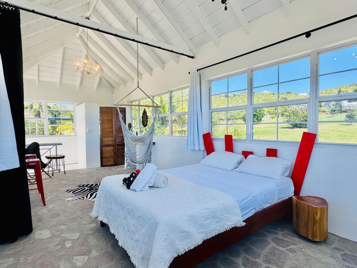 Brand New, unique & tranquil, rest with amazing 180’ panoramic east / west views of volcano & ocean. The “freebird” bedroom suite on Nevis island is born out of the chic eccentric lifestyle of its world traveled owners. Decorated with tastes of a Mediterranean chic, ultra lounge & romantic West Indian grooves ❤️ 1 bed / 1 bath with a freestanding soaking tub & candlelight romantic accents Enjoy watching the monkeys, moonrise & sunset from this truly amazing lookout retreat.