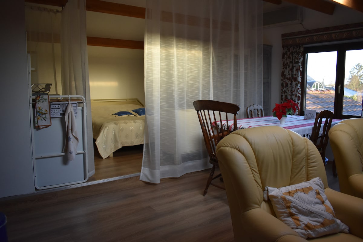 Bienvenue dans la suite merveilleusement spacieuse au 2ème étage de la maison. Dès que vous entrez, vous découvrez la pièce baignée de lumière naturelle. Profitez de ces vues rares sur le paysage verdoyant depuis le balcon de cet appartement magnifiquement rénové. Détendez-vous dans un lit divinement confortable et dormez comme un roi dans cet environnement paisible. A moins que vous préféreriez vous prélasser dans le salon, si propice à l’inspiration?