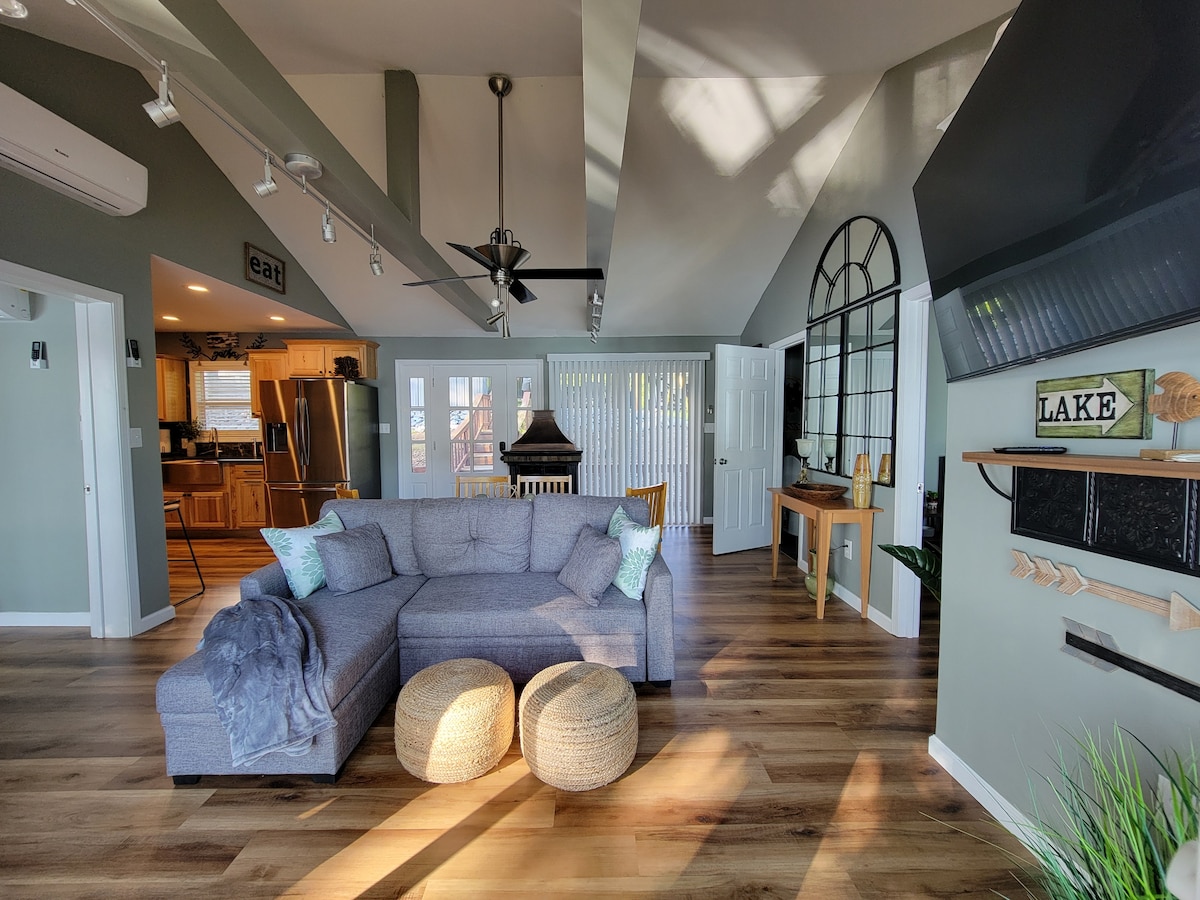 Our Lakehouse is perfect for families. It has 5 bedrooms, 4 queen rooms, 1 bunk room that sleeps 6. The home is perfectly split with two bedrooms, 1 bath and family room upstairs and additional 3 bedrooms, 1 bath with extra family room downstairs. Screened in patio overlooking lake view with TV. Large, partially covered deck with steps that lead down to the dock. Large fire pit area for smores, extra outdoor sectional with fire pit table for lounging. Inquire about pontoon rental availability.
