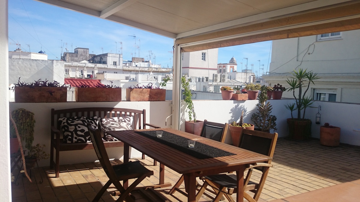 Estupendo ático en el centro del casco histórico. Apartamento ideal para parejas con ganas de conocer los encantos de la ciudad de Cádiz. Situado en pleno centro del casco histórico, en calle peatonal paralela al muelle. Luminoso y alegre , tiene una magnífica terraza privada, un dormitorio con cama de 160x200cm, un cuarto de baño, salón con amplio sofá y cocina americana. La finca no dispone de ascensor.