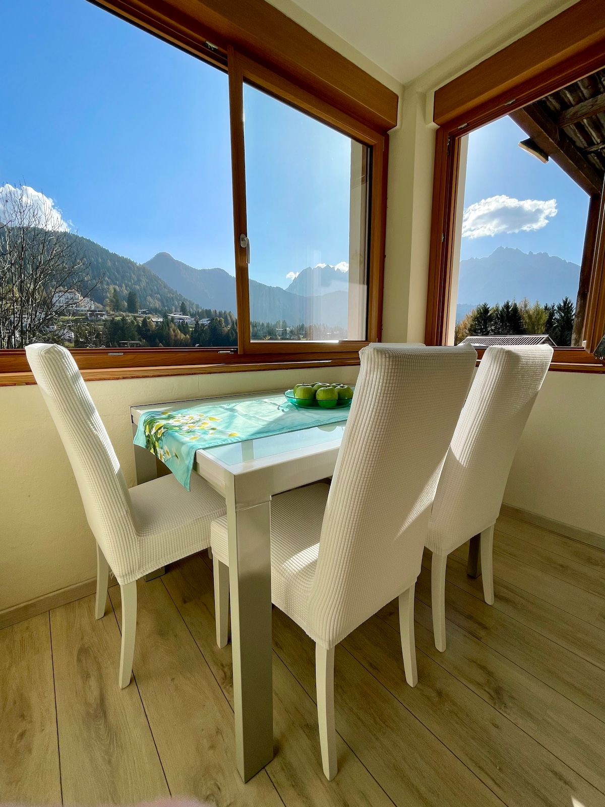 Apartment in the heart of San Vito di Cadore. The apartment consists of: - Fully equipped kitchen with induction hob - Open-plan living room with dining table, queen-size sofa bed and TV - Bathroom with washing machine - 1 double bedroom with queen-size bed - 1 bedroom with 2 single bunk beds - 1 indoor parking space and 1 outdoor parking space - Private wardrobe for skis and equipment Convenient for public transport, it is only 10 minutes from Cortina d'Ampezzo.