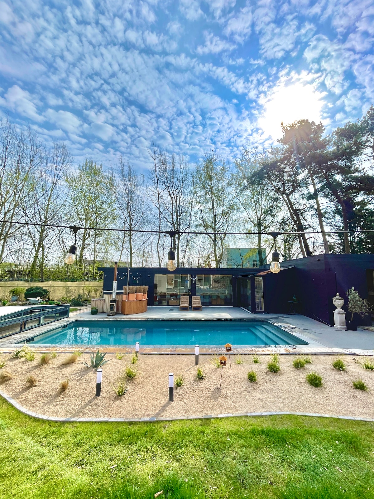 Our assets: A 2,000 m² garden with direct access to the swimming pool. Stay in a guest suite/pool house with Ibiza vibes, including a bar, outdoor kitchen and dining area. Atmospheric evenings with a pellet stove, illuminated pool, hot tub and sauna. A free tandem bicycle available. Central location with easy access to Ghent Antwerp Bruges (also easily reachable by train). A stay that feels pure and relaxing. Our pot-bellied pigs eagerly welcoming you.