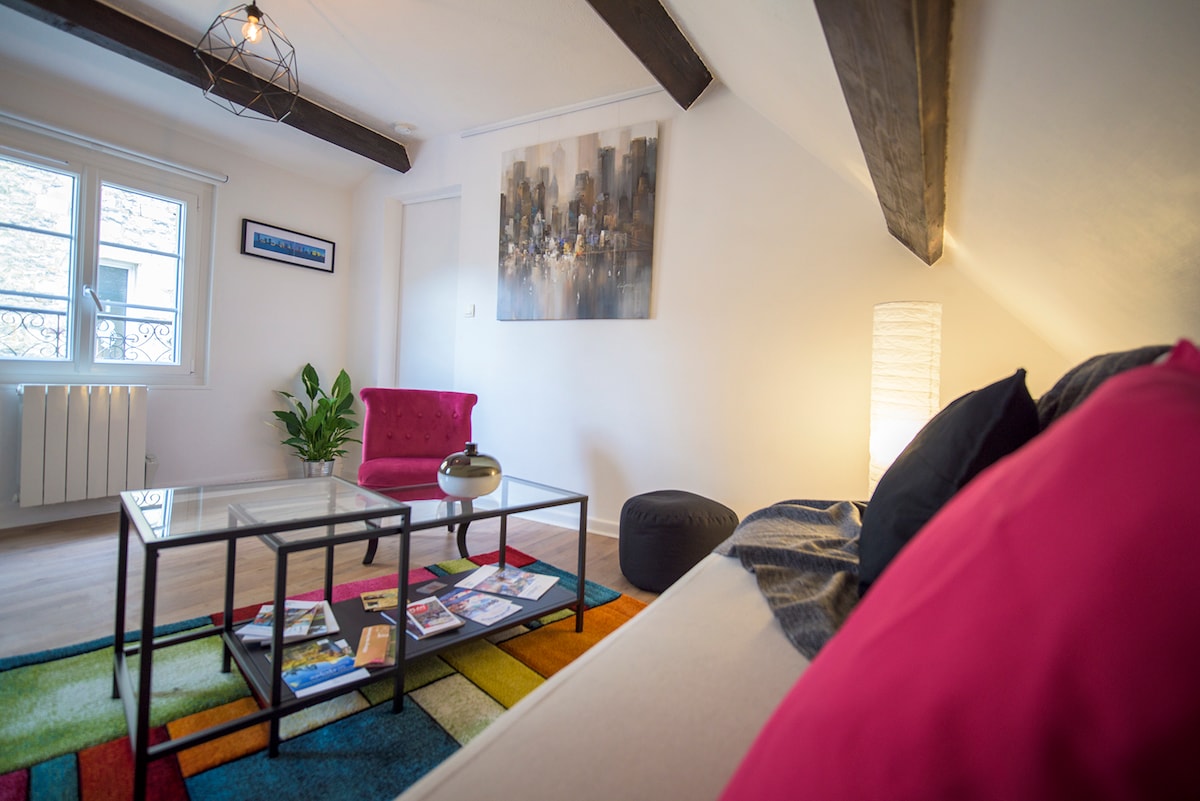 Bienvenue ! Posez vos bagages dans ce charmant duplex entièrement rénové au sein d’un immeuble du 18ème siècle en plein cœur du centre historique de Caen et mettez-vous au rythme de l’art de vivre à la française ! Pierres apparentes, cheminée, porcelaine de Limoges et une vue magnifique sur les clochers de la célèbre Abbaye aux Hommes vous transporteront à l’époque de Guillaume le Conquérant tout en vous offrant le confort d’un appartement moderne.