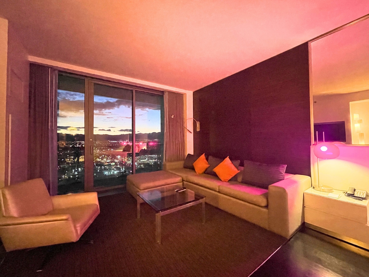 Welcome to Studio 51, a one-of-a-kind, high-energy retreat on the 51st floor of the iconic Palms Place Hotel with NO RESORT FEES! This fully renovated, luxury suite offers breathtaking Strip views, immersive LED lighting, pool table, disco ball and a glitter curtain that sets the perfect vibe for an unforgettable Vegas stay. Unleash your inner star with karaoke nights, play a game of pool or simply relax in style while soaking in the panoramic cityscape.