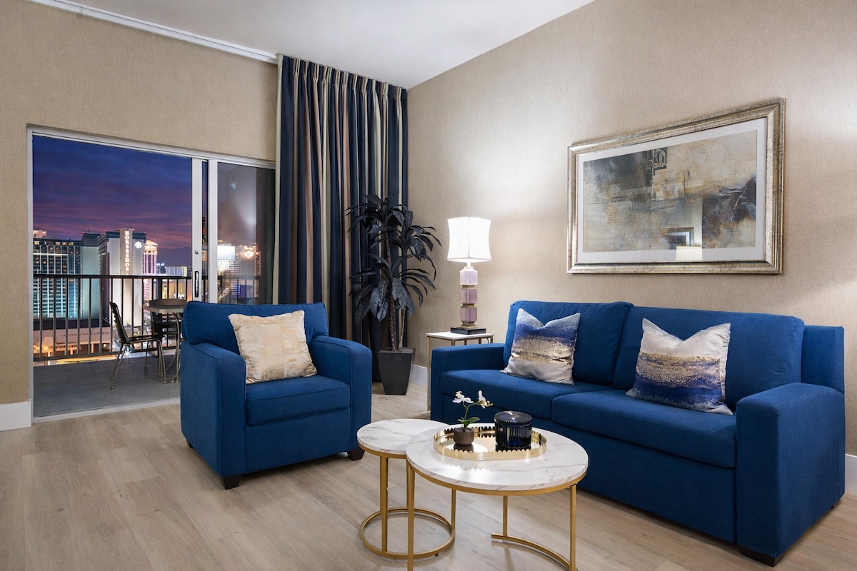 This 631 square foot studio suite is fully equipped and perfect for individuals or small groups who want the Vegas experience while also enjoying the amenities of a home. This luxurious studio is both spacious and welcoming with an unbelievable view. This studio will accommodate up to 4 guests with a King bed and a full size pull out sofa sleeper. • NO RESORT FEE • Free Wifi • Access to pool and fitness center • Walking distance to the Las Vegas Strip and TopGolf • Complimentary parking