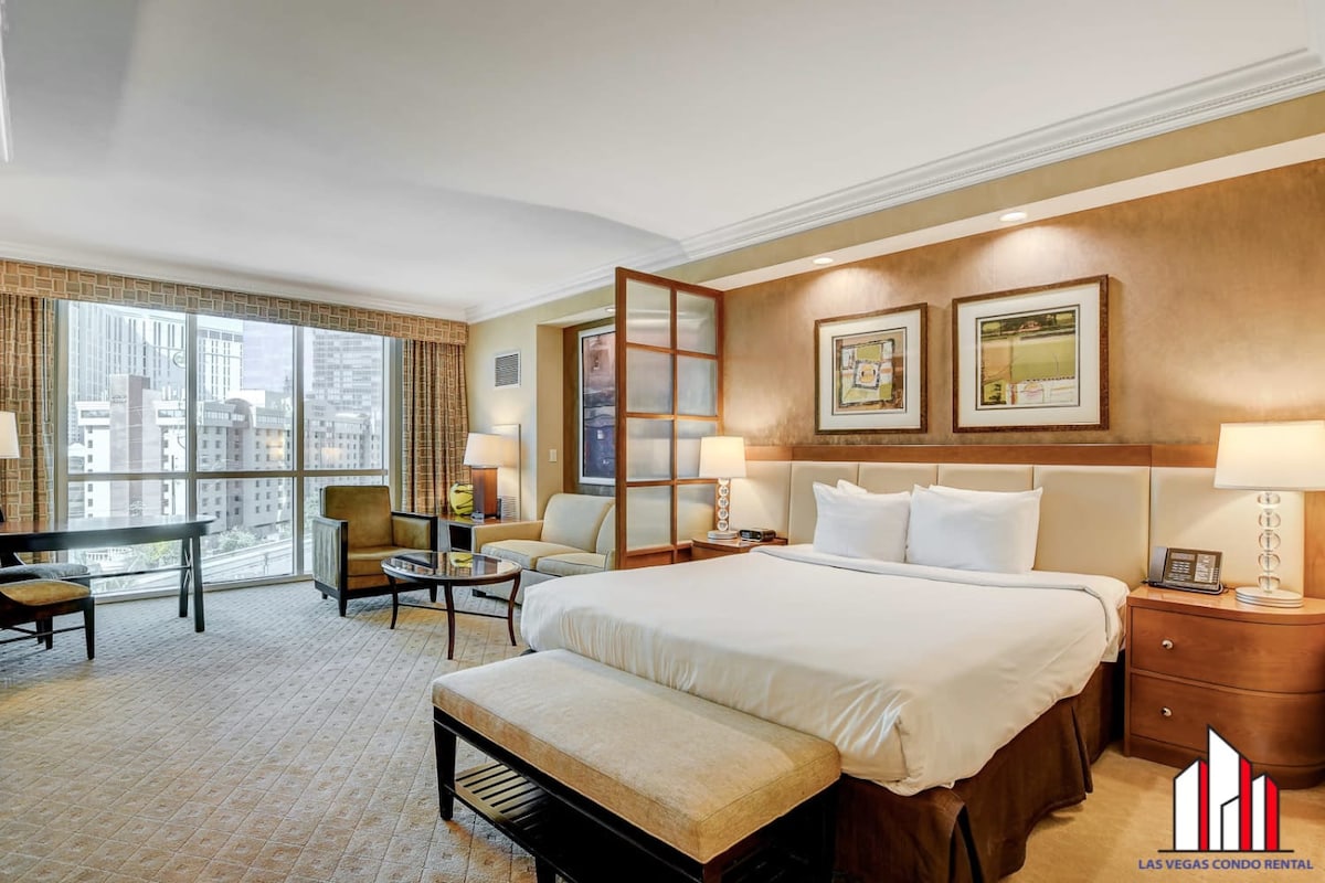 This 631 square foot studio suite is fully equipped and perfect for individuals or small groups who want the Vegas experience while also enjoying the amenities of a home. This luxurious studio is both spacious and welcoming with an unbelievable view. This studio will accommodate up to 4 guests with a King bed and a full size pull out sofa sleeper. • NO RESORT FEE • Free Wifi • Access to pool and fitness center • Walking distance to the Las Vegas Strip and TopGolf • Complimentary parking