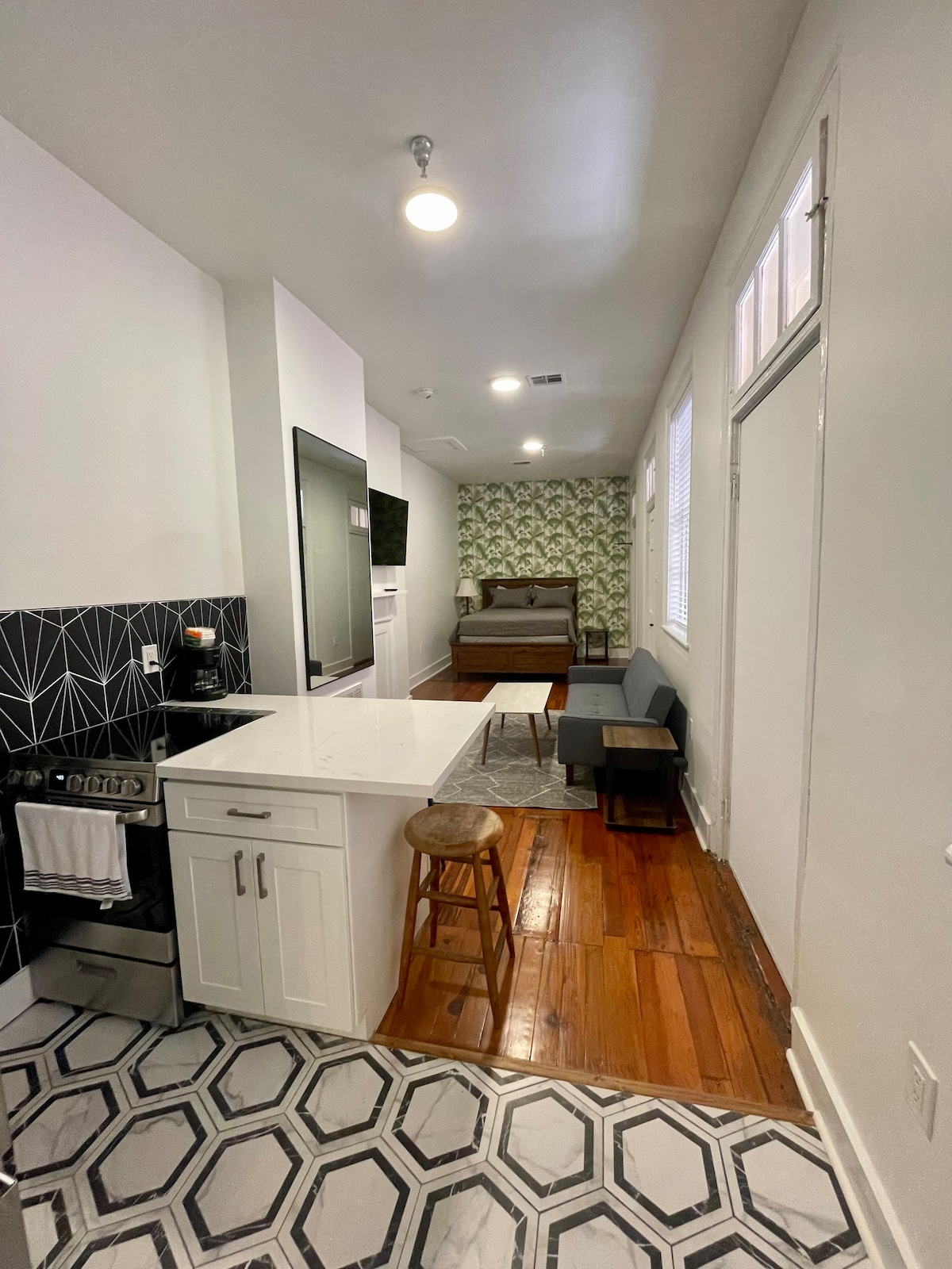 Adorable, newly renovated unit in the Historic Treme neighborhood. 1 block to Historic Esplanade Ave. 1 block to rent Blue Bikes. Bike down Esplanade to the French Quarter, City Park, & the Fairgrounds (Jazz Fest). washer/dryer; mini refrigerator/freezer, mini 4-burner range/oven, and quartz counters in the kitchen; Queen bed; smart tv w/ app access; walk-in shower; guest controlled a/c; tankless water heater, table settings, cookware, coffee pot, toaster, coffee; towels, toiletries; etc