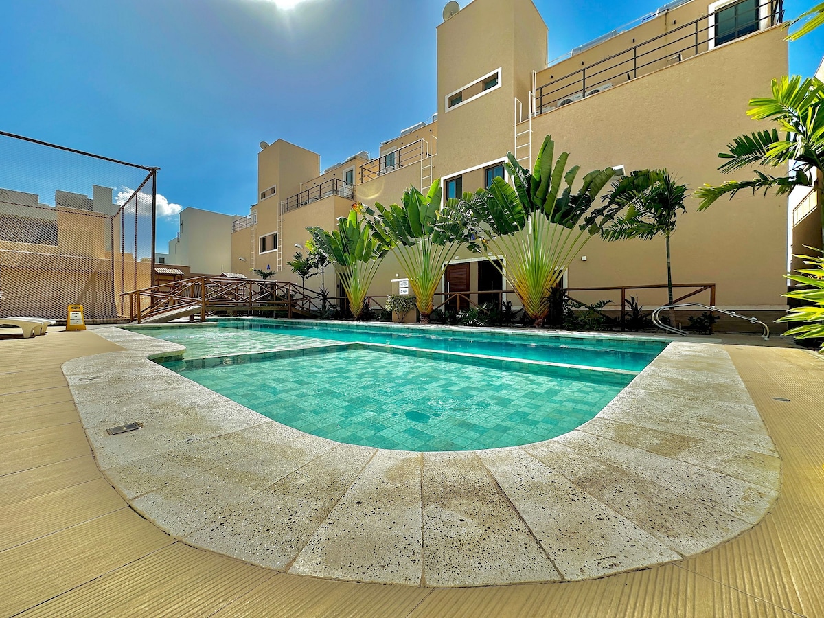 Desfrute do conforto deste Apt. com uma pequena piscina aquecida e hidromassagem, varanda maravilhosa! Dois quartos, sendo uma suíte com uma cama queen e uma cama Solteiro. Uma Demi suite com uma cama casal e uma cama solteiro, ambos os quartos possuem armários e banheiros. Sala charmosa, cozinha equipada com todos utensílios necessários. Terraço na cobertura do condomínio, com vista incrível, o melhor mirante para o por do sol de Flecheiras, churrasqueira para desfrutar com a família e amigos!