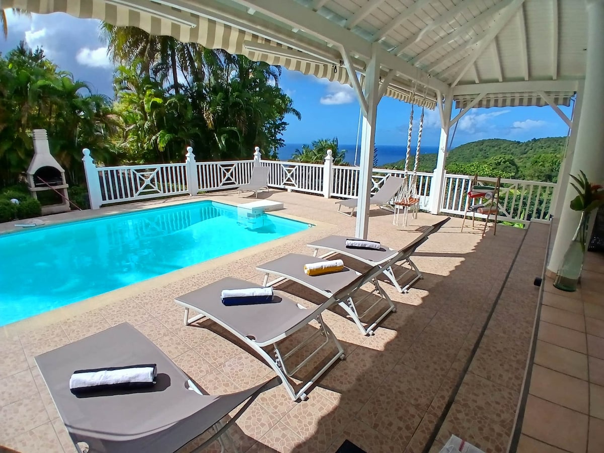À 800m de la plage de grande anse et à 2kms de la ville de Deshaies, la villa récemment remeublée à neuf avec un équipement de standing. Sans aucun vis à vis, entourée par la forêt tropicale, cette villa de bois rouge avec terrasse et piscine vous offre une magnifique vue sur la mer Caraïbe et sur l' île de Montserrat. Jusqu'à 7 personnes, 3 chambres climatisées et 1 mezzanine aérée. Idéal pour se retrouver en famille ou entre amis, en tout confort. Séjour tranquille seulement, pas de fête.