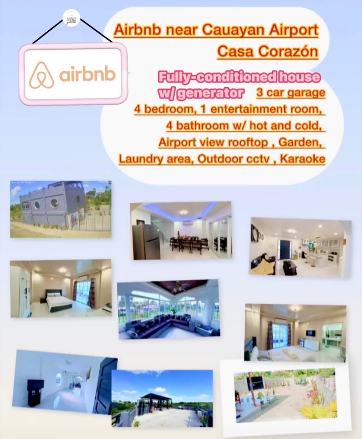 MI CASA ES TU CASA. To ensure the continued enjoyment of this newly built residence, please treat it with respect. The house is conveniently located within a 5-minute drive to Cauayan Airport, 10 minutes to SM Cauayan, 15 minutes to Meraki Garden, and 45-60 minutes to Ilagan Sanctuary, Japanese Tunnel, and Ilagan Arena. You will enjoy the views of the airport and can watch airplanes twice a day. Ideal for family or friends' special occasions.