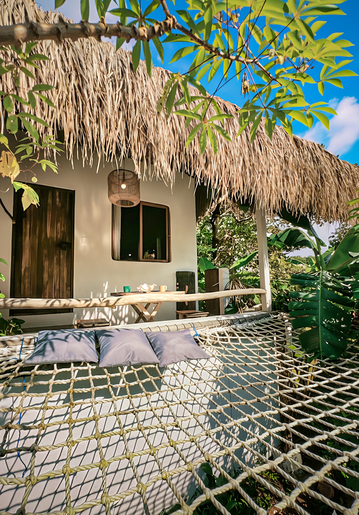 Coze up with your special one in your secluded, contemporary bahay kubo. ✨ 💚🛖 The Love Nest sits in a lush tropical garden through unpaved roads in quiet Lio. A balance of tradition & modernity, with vintage & artisanal elements, large glass openings, roofless heated rainshower, inverter A/C, Starlink & lofted queen bed hidden completely from view. Easy riding 🛵 5min - Lio Beach 15min - downtown 40min - quiet northern beaches Your intimate gateway to El Nido's natural wonders! 💖