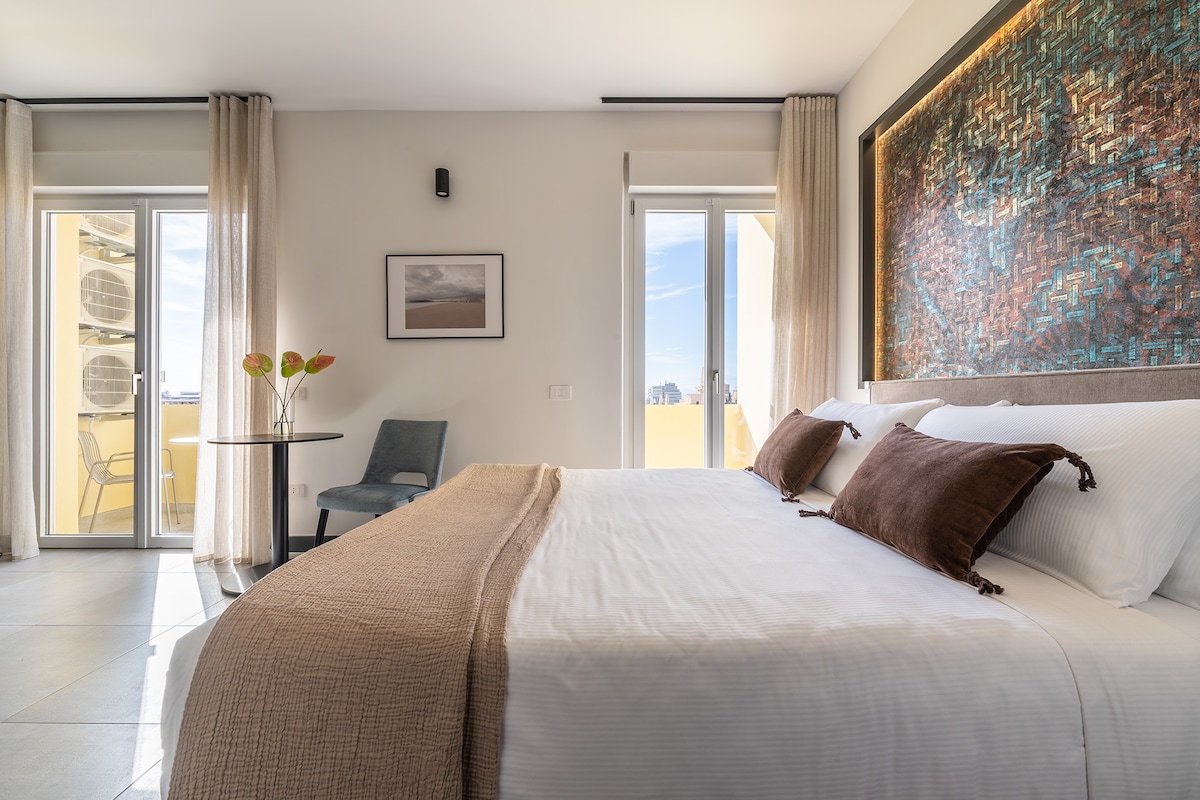 Located on the 6th floor of the Solì Suite & Rooms guesthouse in Via Sonnino 139, the Rustyflower Suite is a refined open space of about 20 m², designed to offer an exclusive stay experience in the heart of Cagliari. The bright and welcoming environment combines modern design and artistic details : the wall decorated in copper and petroleum blue tones creates a warm and sophisticated atmosphere, ideal for those looking for charm and comfort.