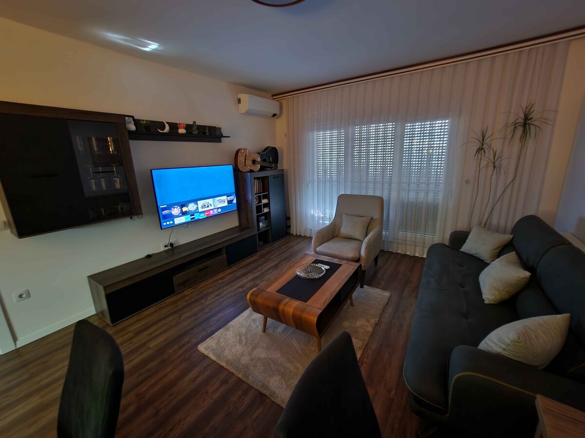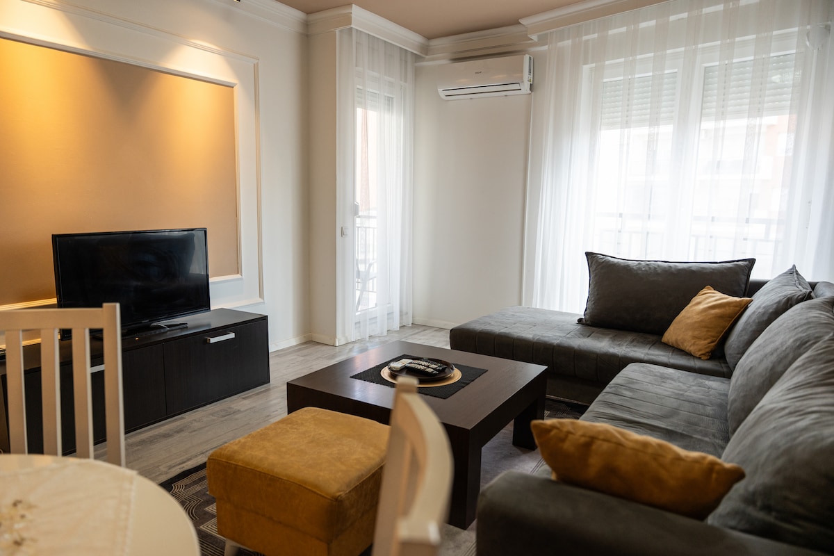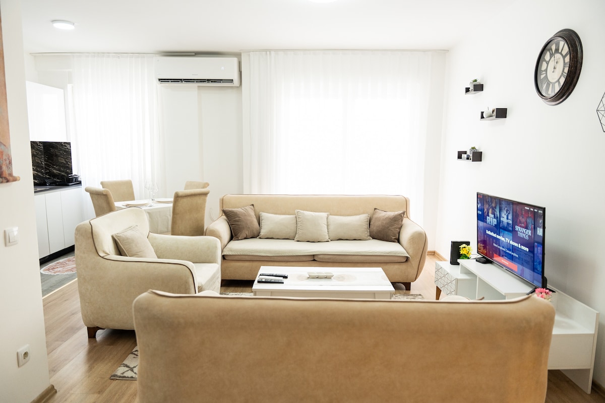 Welcome to this modern, cozy apartment perfect for your stay in Prishtina. Featuring a fully equipped kitchen, a stylish living room with a smart TV, and a comfortable bedroom with a plush bed, this space offers everything you need for relaxation. Enjoy high-speed Wi-Fi, air conditioning, and a private balcony for fresh air. Conveniently located near local attractions and restaurants, this apartment is ideal for both short getaways and longer stays. Book your stay today!