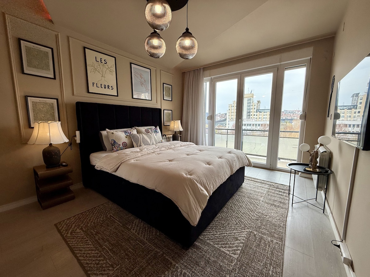 New & Spotless Apartment | Perfect Location | Full Privacy. Located on Ahmet Krasniqi Street, across from the U.S. Embassy and just 1 km from the city center. Supermarkets, cafés, and restaurants are only 200 meters away. Nightlife spots like Duplex Club, Zone Club, and Ysabel Society are within 1–1.2 km, while the main square and cathedral are about 2.5 km away. Relax in a cozy, thoughtfully designed space that feels like home after a day in the city.