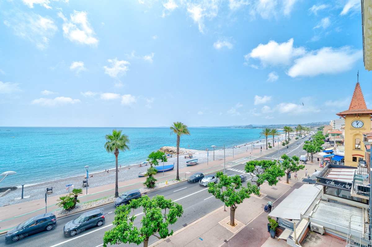 At the heart of local life, situated on the first line , charming studio of 30 m2, with superb panoramic sea views, tastefully decorated, very bright, the 3rd and last floor without lift, all amenities (beach, shops, restautants ...) are around the coner.. We are here to make your holidays special , if you have any questions - don't hesitate to contact us.