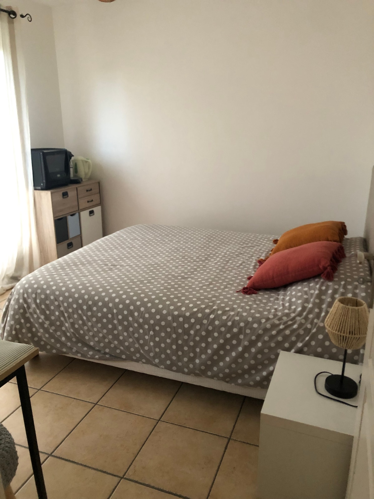 Chambre d'hôtes pour 2 personnes (lit 160 drap fourni ) dans quartier calme, équipé d'une sdb privative , d'un micro-onde , bouilloire, cafetière , serviettes fournis . Pas de cuisine ; idéalement située à 4 kms du centre ville de Cahors avec accès bus gratuit à 80 mètres du logement , proche du chemin de Saint Jacques de Compostelle , à 400m de la voie verte. traiteur , boucherie à 300m . accès au jardin boisé , terrasse et piscine . Places de parking ou devant la maison.