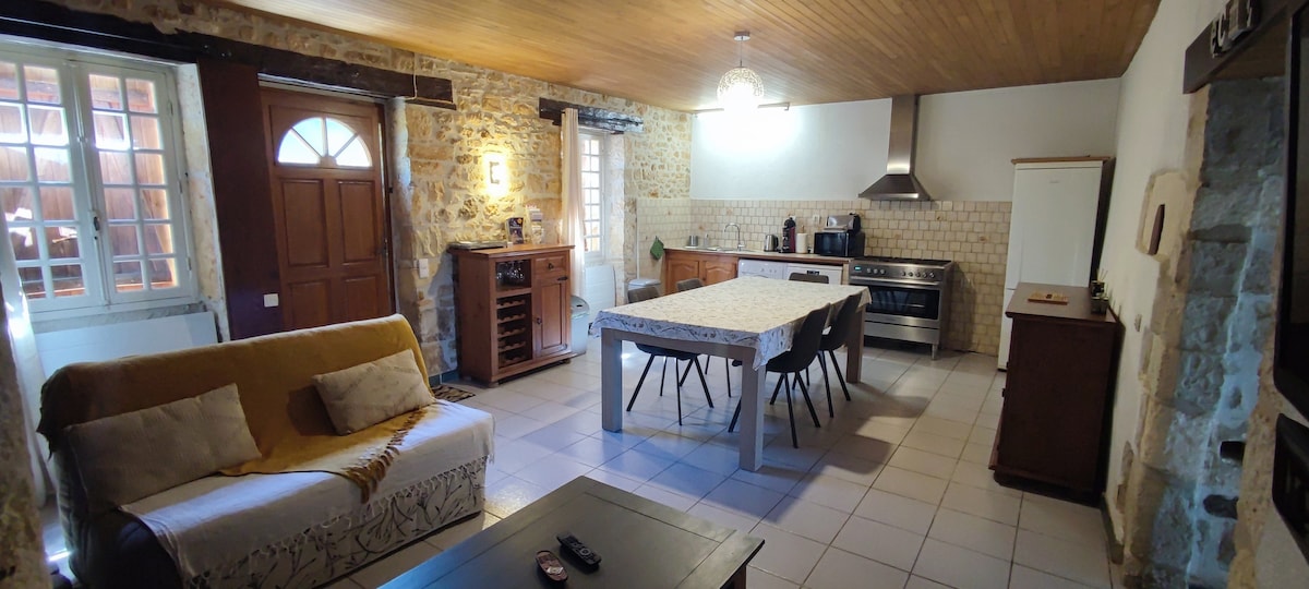 Maison mitoyenne en pierre avec jardin privatif clôturé Grande pièce de vie en pierres apparentes et poêle à granulés ouverte sur la cuisine équipée. Il y a un canapé BZ 140cm 1 chambre avec un lit 140 et une salle d'eau. Nous mettons à disposition le petit nécessaire de cuisine tel que l'huile d'olive, de tournesol, vinaigre, sel, poivre, café, thé et sucre. Le linge de maison est également fourni. L'extérieur dispose d'une plancha et d'une table à manger. parking privé.