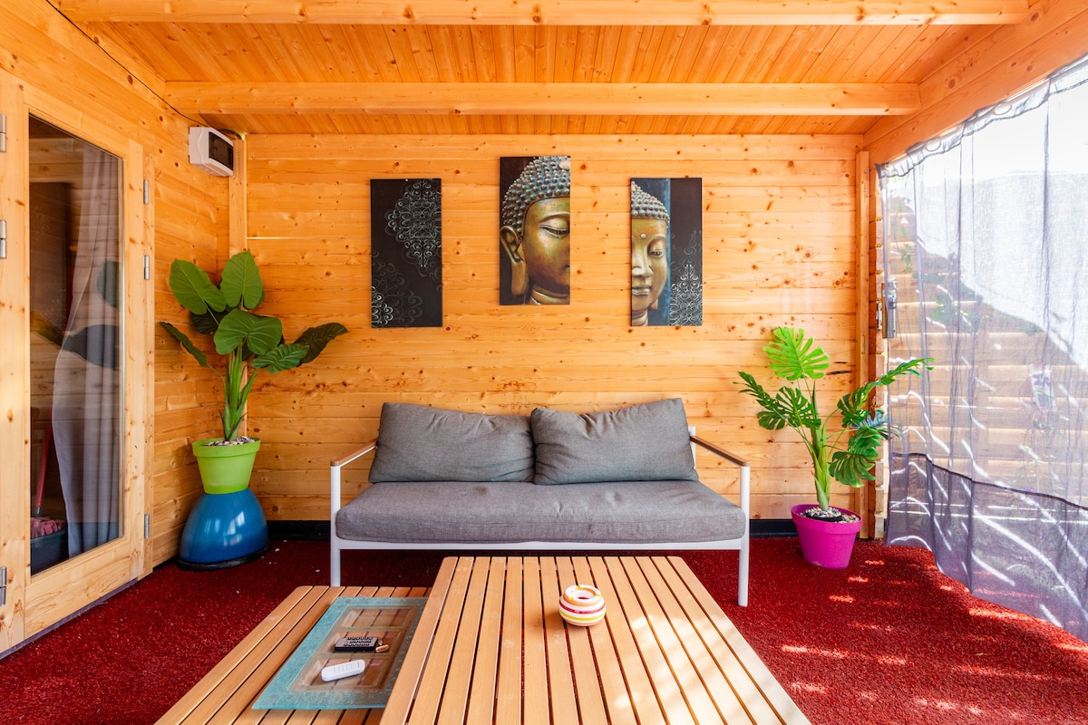Le Nid du Merle is a little haven of peace. Quiet and elegant accommodation, large air-conditioned bedroom with a bathroom with bathtub and shower and an equipped kitchen. Chalet with its own two-seater jacuzzi + Finnish sauna for private use, with open area: garden furniture, terrace, bioclimatic pergola barbecue and plancha. Access to the swimming pool area heated to 30°C and a large outdoor jacuzzi. Boulodrome (petanque kit). Mini animal park, flower beds over 2 ha.