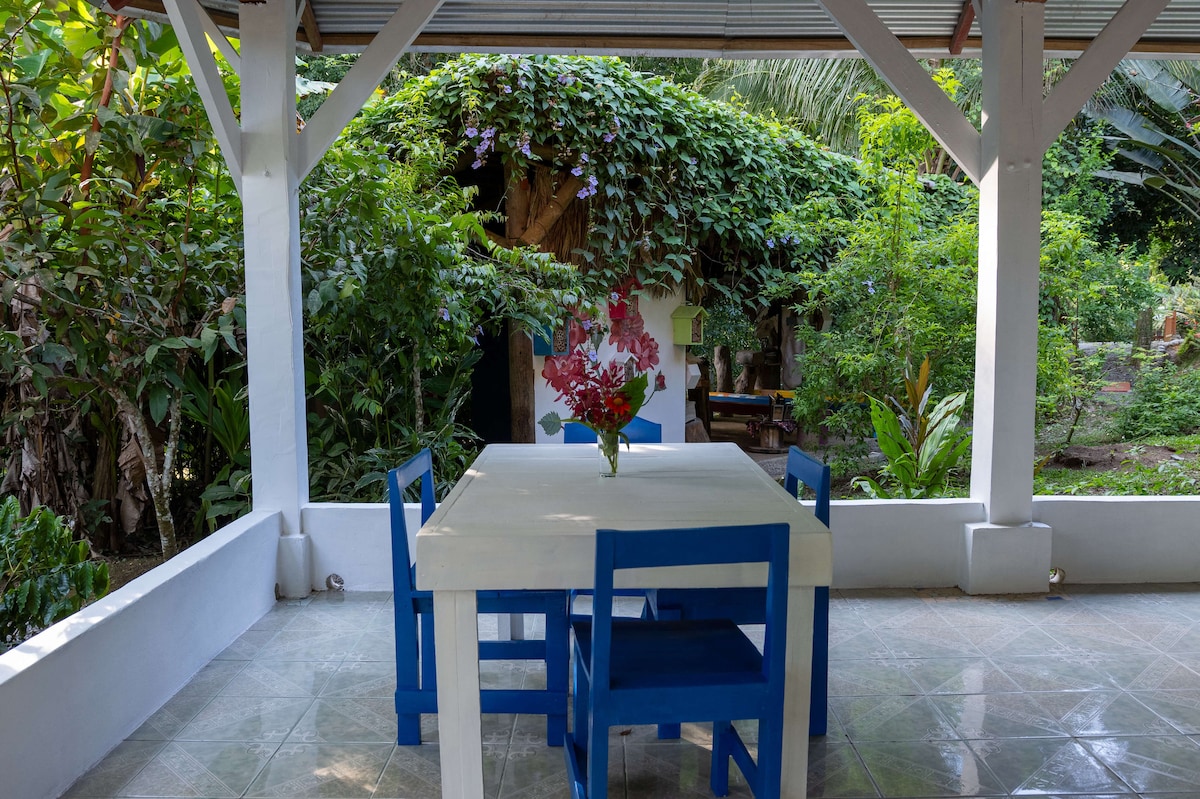 Nestled on two lush acres along the Cocles River, the lower-level Garden of Eden Studio is an open-air retreat, surrounded by tropical gardens with sloths, toucans, monkeys, and butterflies. Enjoy a private garden shower under the stars, relax on a spacious veranda with hammocks, and walk just 5 minutes to the coast’s best grocery stores, 10 to the areas most pristine beaches, and 5-min taxi to Puerto Viejo’s vibrant shopping, restaurants and nightlife.