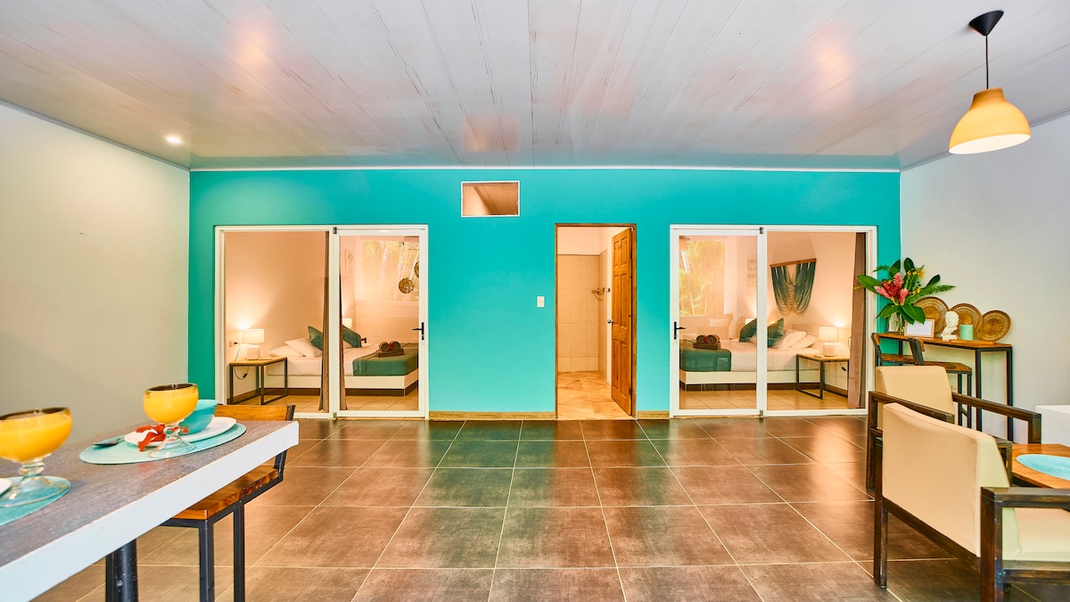 Garden-Level Queen Room in a Boutique Villa | Breakfast Included This private garden-level room WITH A SHARED BATHROOM WITH 1 OTHER ROOM features a queen-size bed and is ideal for two guests. It is one of ten rooms within a shared boutique retreat villa. Enjoy a private entrance from the garden and peaceful garden views. The room shares a well-maintained bathroom with just one other guest. Daily breakfast is included. 100meters to Cocles Beach