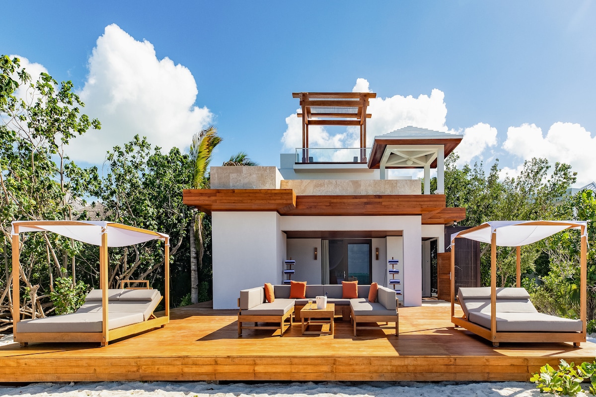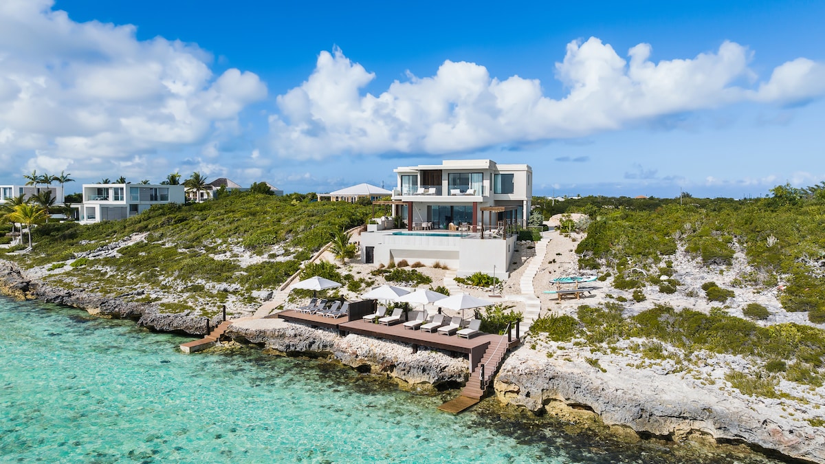 Enjoy postcard-worthy ocean views at Villa Vieux Caribe. Set on lush grounds on the southern coast of Providenciales, the seven-bedroom stone villa has traditional stone architecture and panoramic views of Chalk Sound National Park and Caicos Banks. Snorkel just off the property’s beach in calm Taylor Bay, sunbathe on one of several decks, and retreat to private, hotel-like accommodations in the evening.