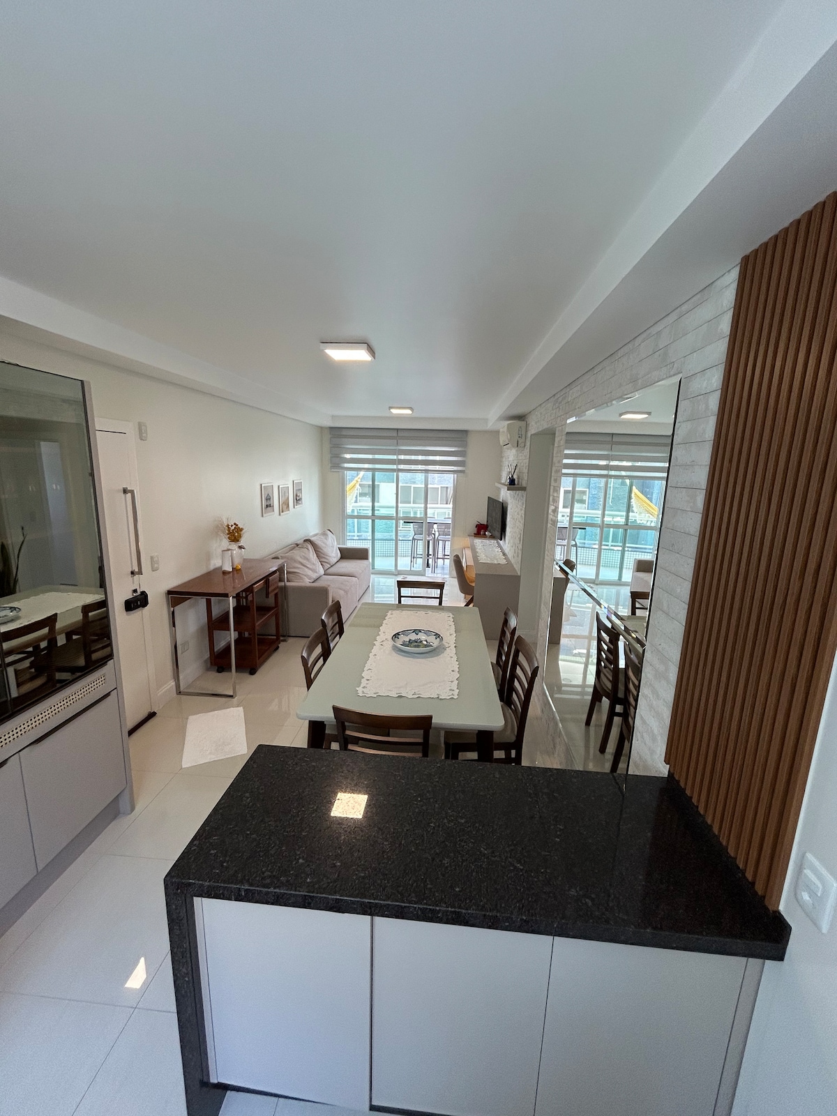 Divirta-se com toda a família neste lugar cheio de estilo. O apartamento possui dois quartos, sendo um quarto de casal, um segundo quarto contendo um beliche, mais uma cama de solteiro e um colchão extra, na sala um sofá cama. Há um ar condicionado split na sala e ventiladores de teto nos quartos. A sacada possui churrasqueira privativa e uma bela vista para o mar. Não fornecemos roupas de cama e banho. Caso for um problema trazer, fale comigo que verifico para providenciar