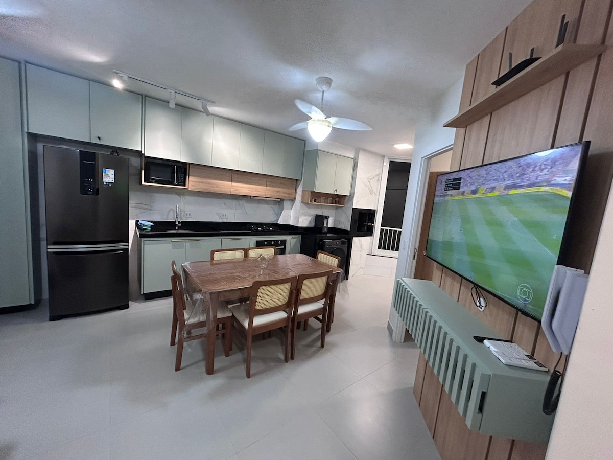 Apartamento novo, pertinho do mar, com vista para lindas montanhas e por do sol magnifico. Área comum contendo: Piscina de adultos, Piscina infantil, 2 espaços para as crianças: um Parquinho fora e um espaço kids fechado com piscina de bolinhas. Quadra para os amantes do Futebol, Beach tennis, ou outro esporte. Roupas de Cama e Banho NÃO são disponibilizadas. NÃO podemos aceitar animais em nenhuma hipótese. Aceitamos + 2 hospedes, chegando a 7, mediante pagamento e acerto extra.