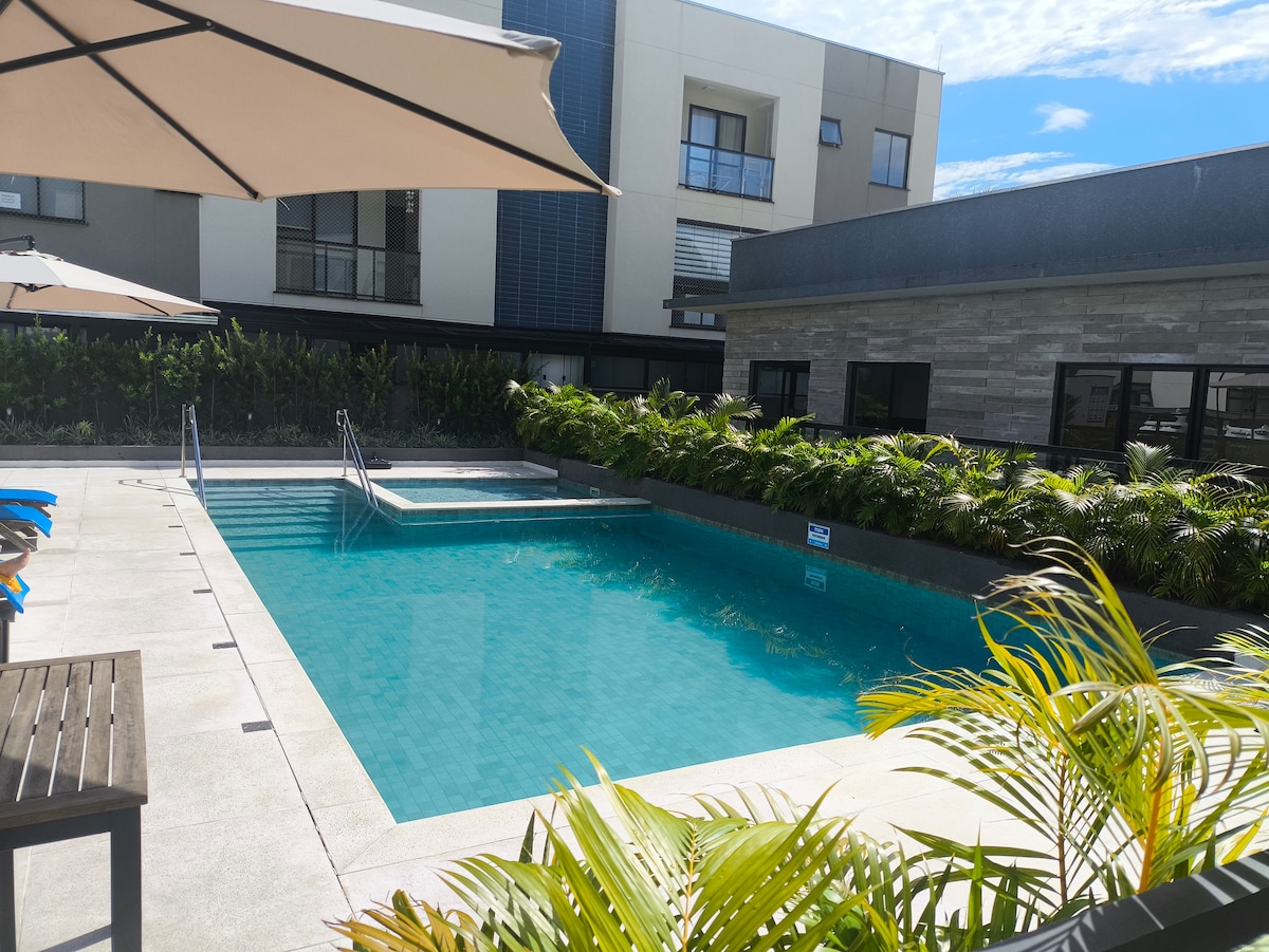 Divirta-se com a sua família neste lugar cheio de estilo, novinho e cheiroso bem próximo à praia. É um espaço bem equipado com 2 quartos com ar condicionado, um banheiro, máquina lava e seca, camas aconchegantes, roupas de cama, toalhas e utensílios de cozinha, tudo para momentos de conforto e descanso. Espaço para suas crianças brincarem e se divertiram na piscina ou em quadra de esportes. Academia com esteira e bicicleta ergométrica. Banheiros auxiliares na área da piscina que ficam próximos.