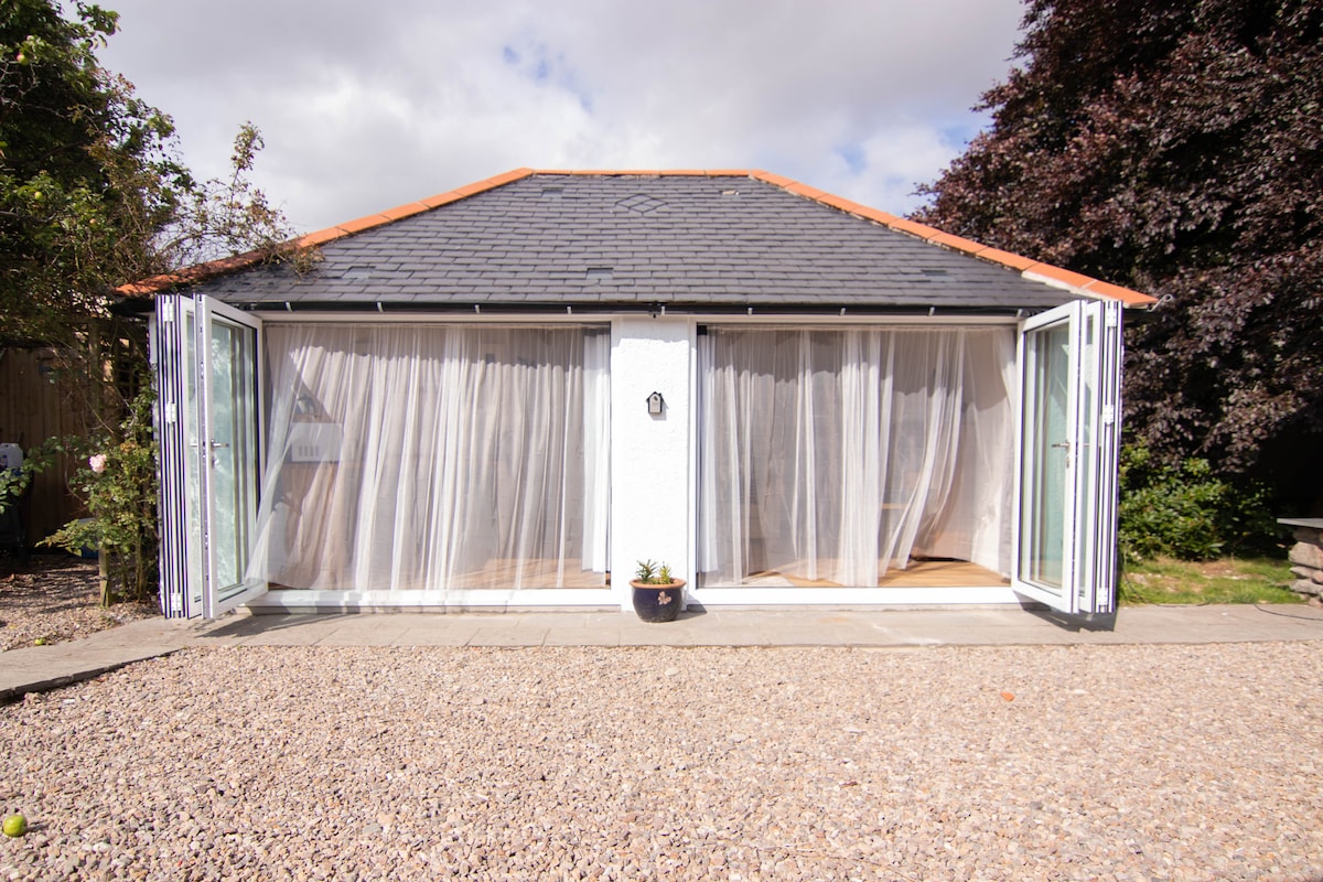 Built in 2023 and finished to a high standard, enjoy a stylish experience at this centrally-located one bedroom private guest space. Located in the Royal Burgh of Tain, off the A9 & NC500 route, this well equipped space is situated in a family garden with off road parking. The self contained building boasts, a double (UK standard) bedroom, shower room and kitchen/diner/sitting area. Large patio doors lead out to the decked area in the garden. 35 miles north of Highland capital Inverness.