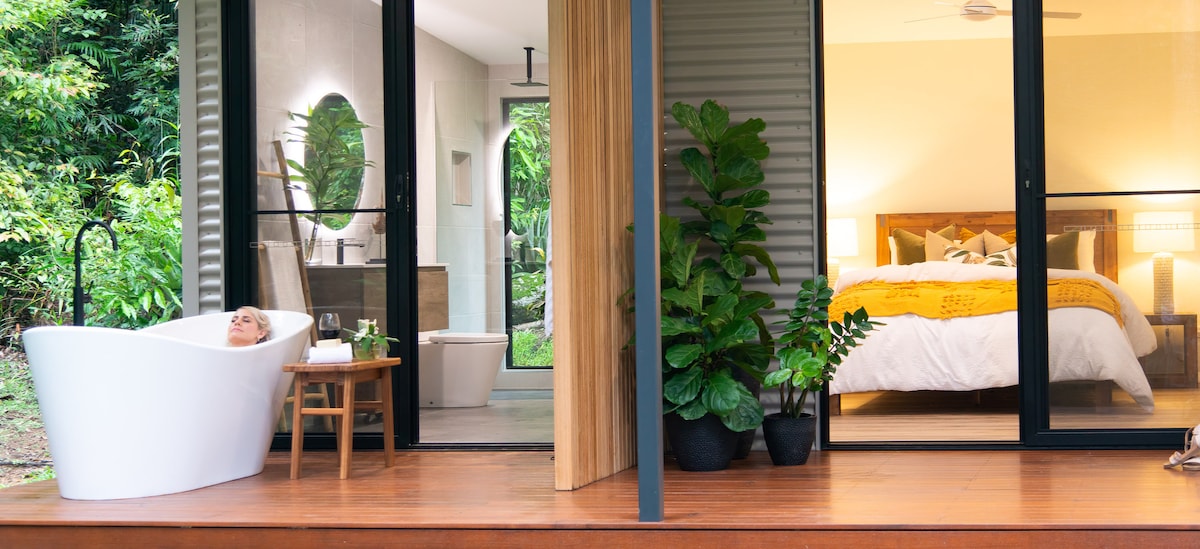 Escape in style to a stunning retreat five minutes from Kuranda Village. Fully self-contained, contemporary, one-bedroom cabin with outdoor bath, nestled in a rainforest garden. Take in the serenity and wildlife, and enjoy a special getaway. Relax • Refresh • Rejuvenate 2 night minimum stay. Unfortunately we no longer take single night bookings. If you are a returning guest please message us privately for a discounted rate. You can also book direct to save.