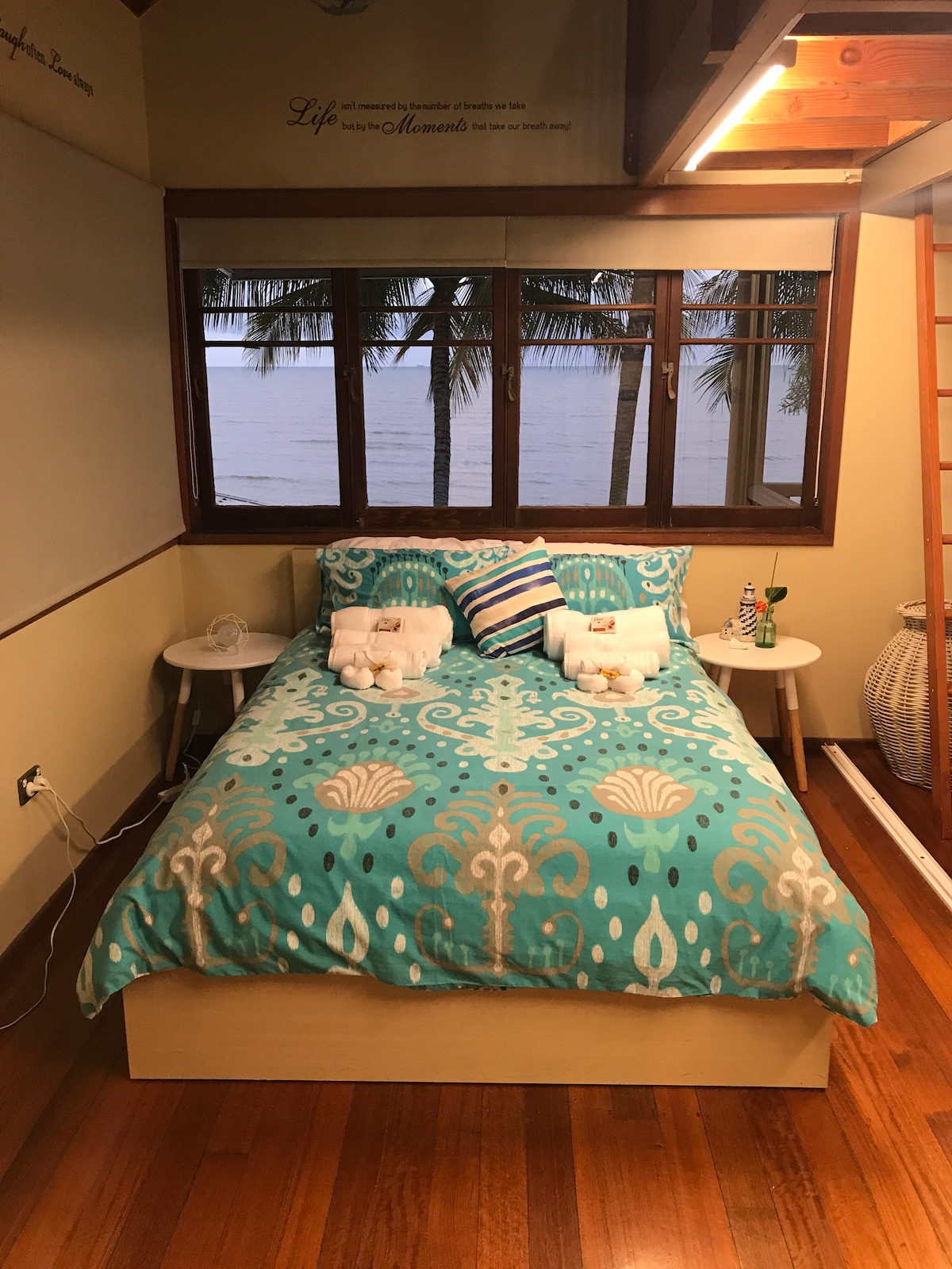 Unique beachfront shack nestled in the quiet streets of Holloways Beach. Just 10mins from the Airport and 15mins from the CBD, this is one of few absolute beachfront locations in Cairns offering a place to escape. The cosy open living accom has sea views from the deck and front rooms. With direct beach access, all you have to do is step off the deck. Here you can enjoy a cuppa or quiet beverages looking out over the sea. Experience falling asleep listening to the waves gently lapping the shore.