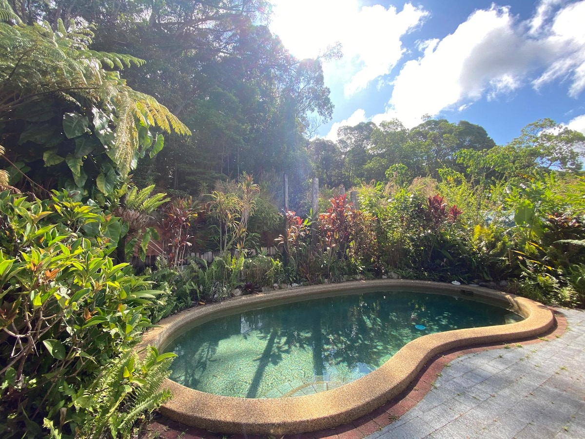 Wake up to the sounds of rainforest birds, spot wallabies, pademelons and bandicoots and keep your eyes peeled for the resident cassowary who often strolls through. Stay in our rustic dwellings surrounded by manicured gardens inclusive of: ➼ Pool, large deck AND a hot tub. ➼ Fire pit ➼ Indoor pool table ➼ Smart TV with Netflix ➼ Wifi ➼ Fully equipped and stocked kitchen ➼ Laundry with washer and dryer ➼ Authentic rainforest experience Early check-in | late check-out