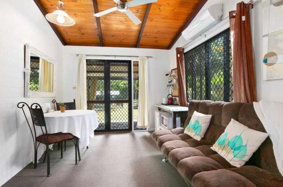 15 mins drive from town. Gorgeous Rainforest Haven! Private Entrance,Self Contained,Kitchen,lge bedroom+ensuite,courtyard, table chairs, Aircon. Sink Microwave cutlery crockery cooking utensils,tea coffee milk, toaster, portable cooktop, Air-fryer, BBQ. TV+Netflix. Attached to thick front wall of house that also has an unused locked door as part of wall . Still Very private. Lil & Rob live here +Ziggi our small non-malting clean humanoid pooch! Share laundry pool yard. Tapwater great4drinking
