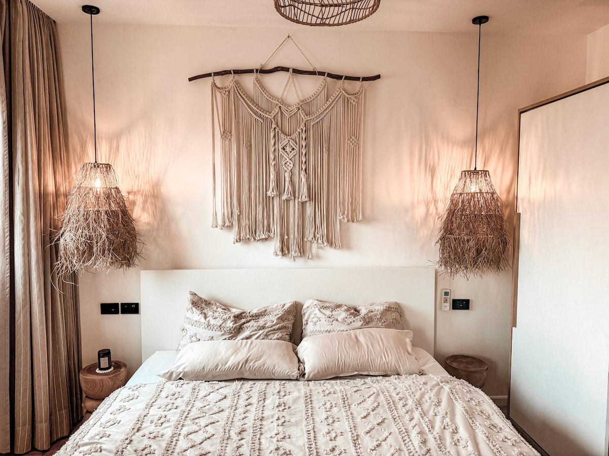 Welcome to our Nileview loft, Your charming home in the heart of Zamalek Island, Cairo's most central, safe, and vibrant hub. The stylish living room boasts a 55-inch curved smart TV and panoramic views on the Nile. A boho living room with a bamboo swing overlooks a gorgeous Nile view. Two cozy bedrooms featuring memory foam mattresses, hotel-grade Egyptian cotton beddings. Relax in comfort and style with a touch of bohemian charm by the Nile."
