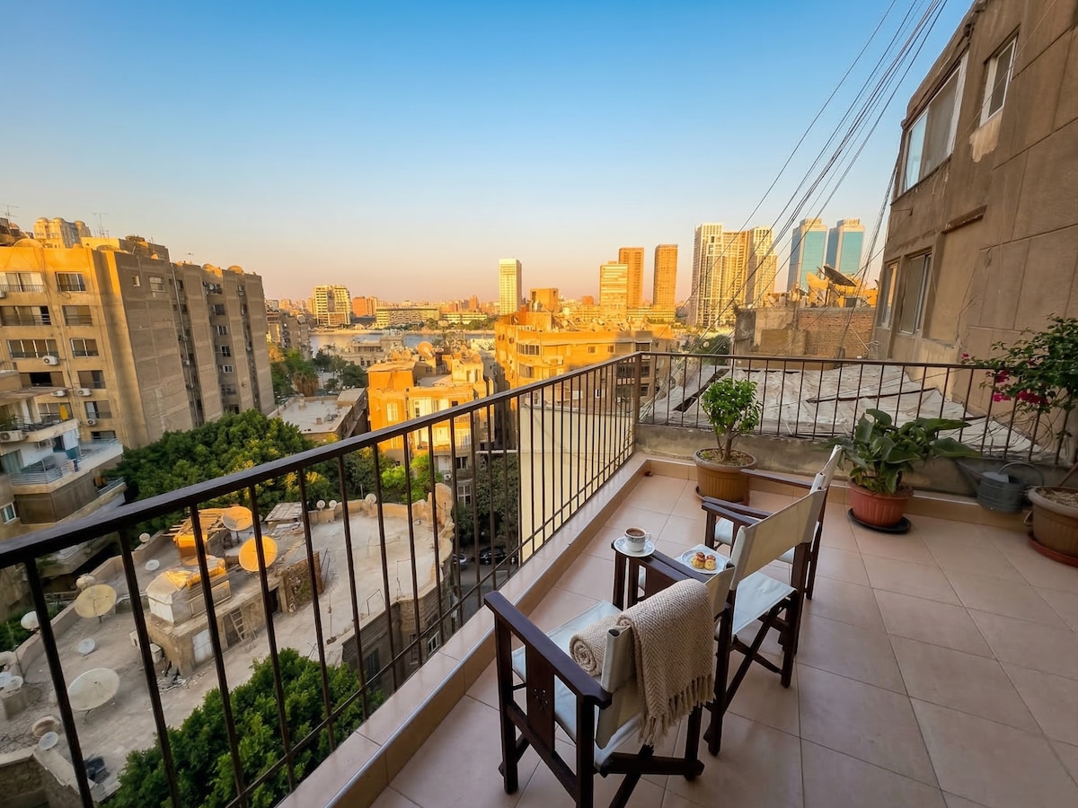 City Skyline Views: Charming, Cozy 1 bedroom 1 bathroom apartment in Agouza. Close to Tahrir Square, Egyptian Museum, Zamalek neighborhood and walking distance to British Council. 64m2 Terrace with beautiful view over the Nile and Cairo Tower. It is fully equipped with all you might need, freshly renovated.