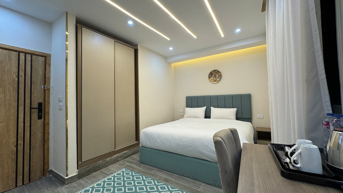 Welcome to our charming 1-bedroom in Giza, where you can enjoy spectacular views of the Great Pyramids right from your private balcony. Featuring a cozy bed and an attached bathroom, this space is perfect for relaxation after a day of exploration. Located just a 5-minute drive from the Giza Pyramids and the Grand Egyptian Museum, our apartment is also within walking distance to delightful restaurants, cafes, and supermarkets. Enjoy a complimentary breakfast on our rooftop cafe.