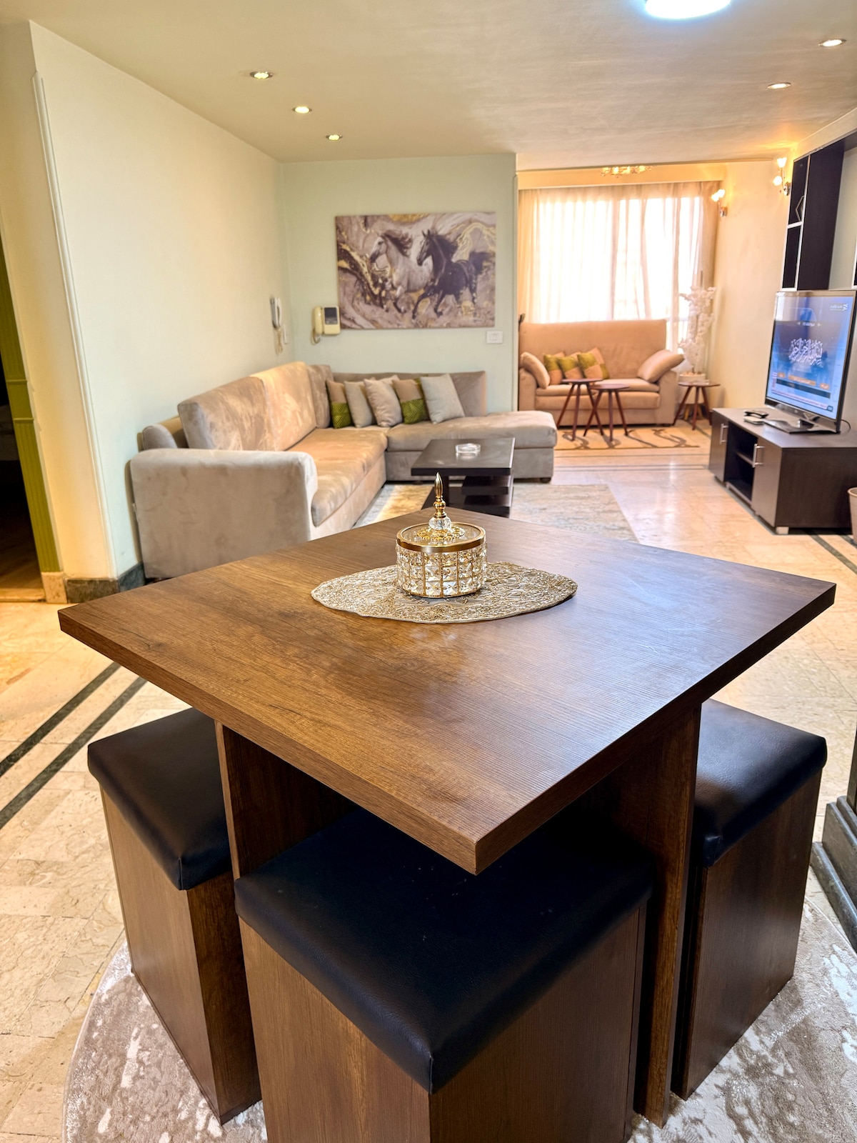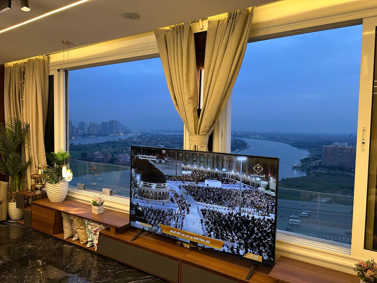Modern Appartment front nile river 2-bedroom apartment next to the Holiday Inn. Enjoy a direct Nile view from a private balcony. Fully air‑conditioned, with oil heaters, two bathrooms, and a fully equipped kitchen. The living room features a 65-inch Smart TV with Netflix, Amazon Prime, live sports, and international channels. Fresh towels and bed linens provided for a comfortable stay.