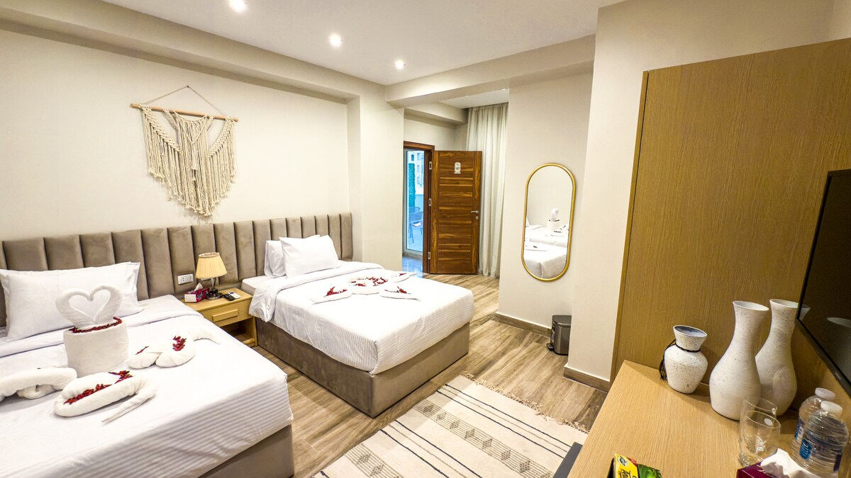 Experience the charm of Cairo in style. Our boutique double room offers a perfect blend of comfort and elegance — ideal for both business and leisure travelers. Enjoy your stay in a beautifully designed space featuring a private bathroom, 55-inch Smart TV, air conditioning, mini bar, Nespresso machine, and tea kettle for your convenience. Located in the heart of Downtown Cairo, you’ll be steps away from the city’s most vibrant restaurants, cultural spots, and attractions
