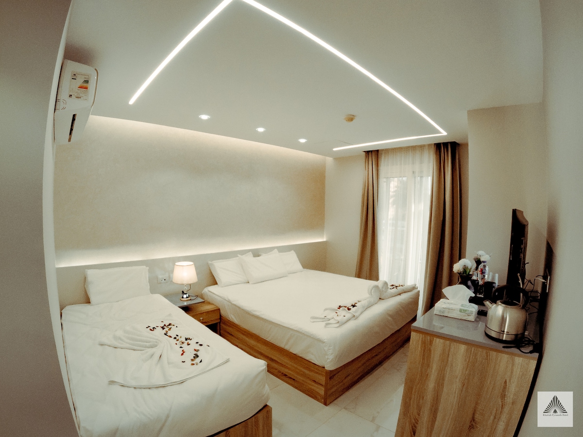 Welcome to our stunning hotel room offering an unmatched view of the iconic Pyramids of Giza. Perfectly designed for comfort and convenience, this room provides a unique blend of modern amenities and timeless beauty. Experience Privacy and Serenity: Enjoy the full privacy and tranquility of your room, while being steps away from the enchanting pyramids.