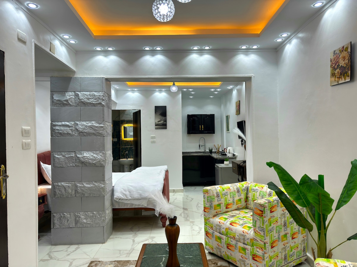 Luxury studio with a modern design and a relaxing atmosphere, located in a quiet area in Nasr City near City Stars Mall. Features a private freestanding bathtub with hot water and shower, orthopedic mattresses for ultimate comfort, a fully equipped kitchen, and high-speed fiber Wi-Fi. Perfect for couples, solo travelers, and business guests looking for a clean, cozy, private, and peaceful stay close to the airport and main attractions.