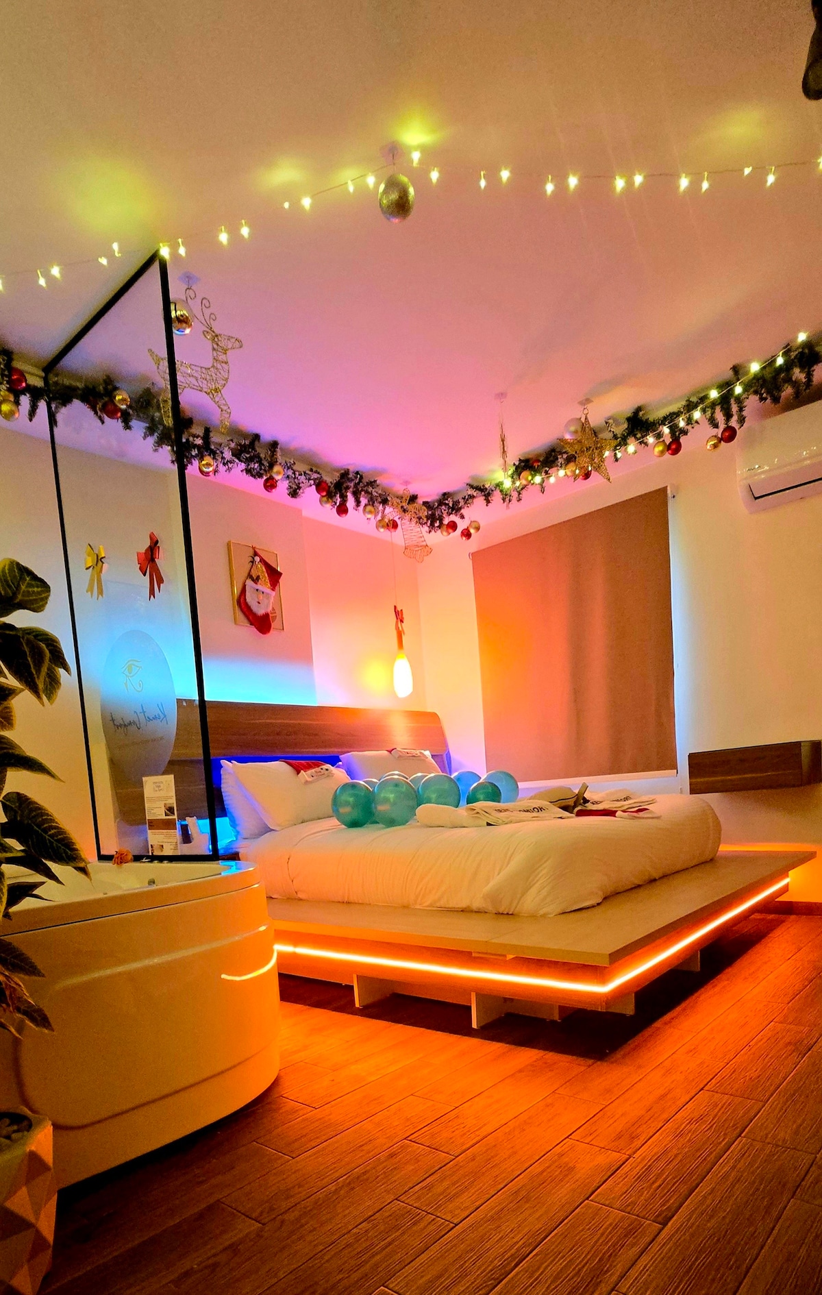 Experience a once-in-a-lifetime stay at [ Cleopatra’s Suite With Jacuzzi ] Pyramids View, a private and stylish studio offering a direct, uninterrupted view of the Great Pyramids of Giza — right from your window, balcony, or even your private jacuzzi.