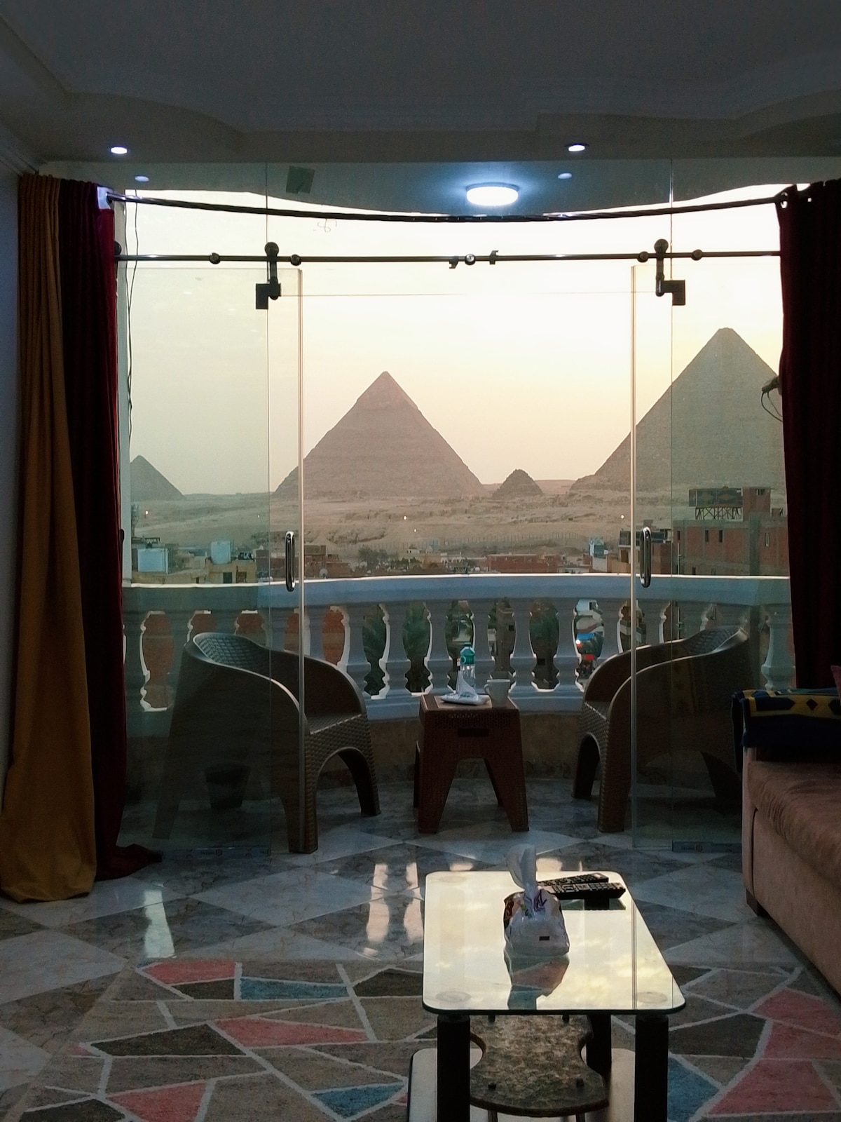 Big apartment ( 150 M² ) has a Jacuzzi with Pyramids view in OLD GIZA ( Nazlet El-Samman ) in small street , the apartment is full with antique furnitures & salt lamps for positive energy, apartment has 2 big suites, each suite has an attached bathroom, the balcony is about 30 metres square and there is an elevator, there is hot water and Air-condition .. very good internet.. There is free breakfast, water, coffee & tea, also you can use the washing machine