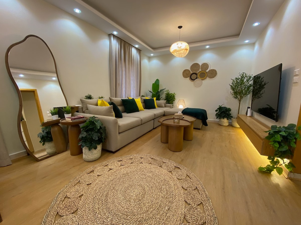 Huge Skyline Terrace Luxury Apartment A stylish 3BR, 3 Bathroom apartment with 4 beds in a quiet gated community. Enjoy a huge private rooftop terrace with skyline views, ping-pong table, babyfoot, BBQ and outdoor dining area. Sleeps 7, fully equipped kitchen, bright living space. Near Cairo Festival City, 5A, U Venues, Waterway and Downtown Mall, 20 mins to airport, 30 mins to Pyramids and GEM. Apartment is on the 3rd floor with stairs only (No Elevator) , kind doorman assists with luggage.