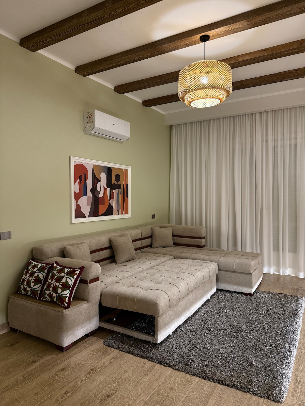 An ENTIRE APARTMENT with a back garden situated in a beautiful and green area in a peacefully integrated community fulfilling all residents' needs. Rooms are newly furnished, air conditioned, smart T.V. and all amenities you might need, super CLEAN and QUIET. The apartment is 25 minutes from Cairo intInternational Airport. coffee shops, restaurants, supermarkets, and pharmacies are all nearby. Hotel standard quality with home like comfort offered with a REASONABLE PRICED.
