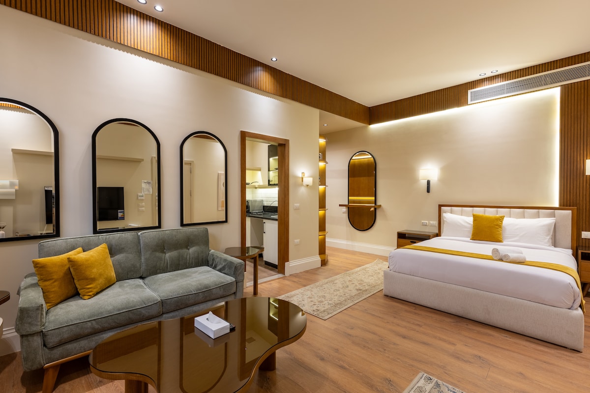 Experience The Forge, an executive King Bed suite in Privado, Madinaty’s premier gated community. Designed in sleek industrial style, it features a spacious living area, large Smart TV, and modern finishes inspired by metal and stone. Perfect for business or leisure, with high-speed Wi-Fi, a fully equipped kitchen, and access to cafés, parks, and The Open Air Mall just minutes away.