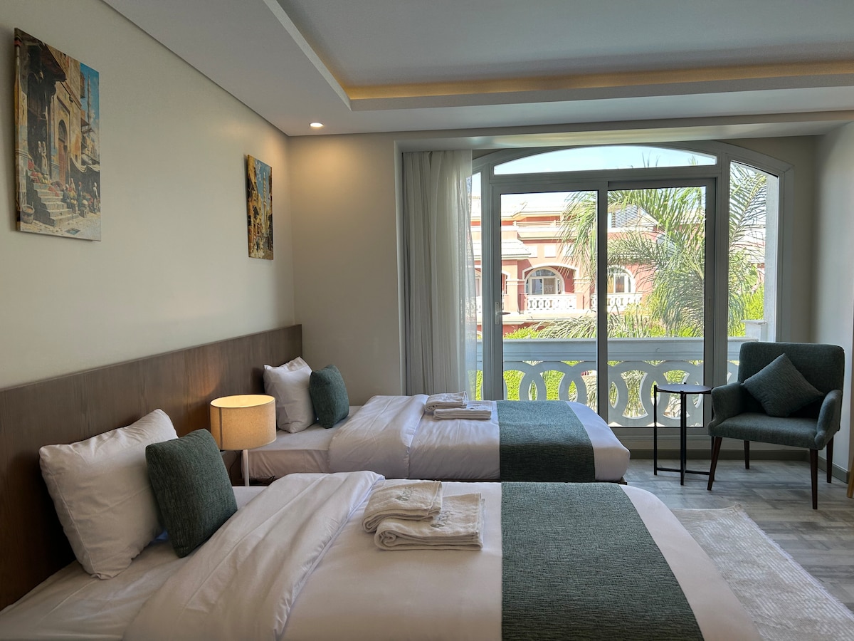 Welcome to our Deluxe 2-bedroom in Golden Gates Compound! Just 5 minutes from Maadi, 10 minutes from New Cairo and Nasr City, and 15 minutes from Cairo Airport and Heliopolis. Enjoy a fully equipped kitchen, stylish modern-boho decor, 24/7 security, and on-site amenities like coffee shops, restaurants, Carrefour, and a hospital. Relax with a 65-inch smart TV and high-speed Wi-Fi. Your Cairo adventure starts here—we can’t wait to host you!