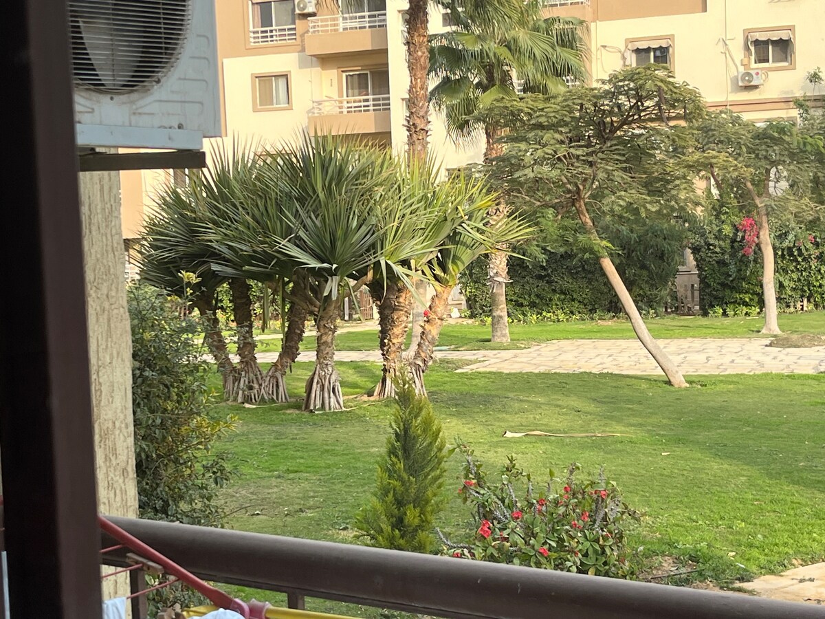 Ground floor haven that will keep you away from the busyness of Cairo, located only 1min away by car from Waterway 1. Bring the whole family to this great place with lots of room for fun. This simple 2 BR apartment features 1 king bed and two double beds with high-quality mattresses to give you the best sleep. A fully equipped kitchen and coffee machine to keep your taste buds occupied! 1.5 Bathrooms that are simple and has everything you need (hot showers, shampoo, shower gel and more)