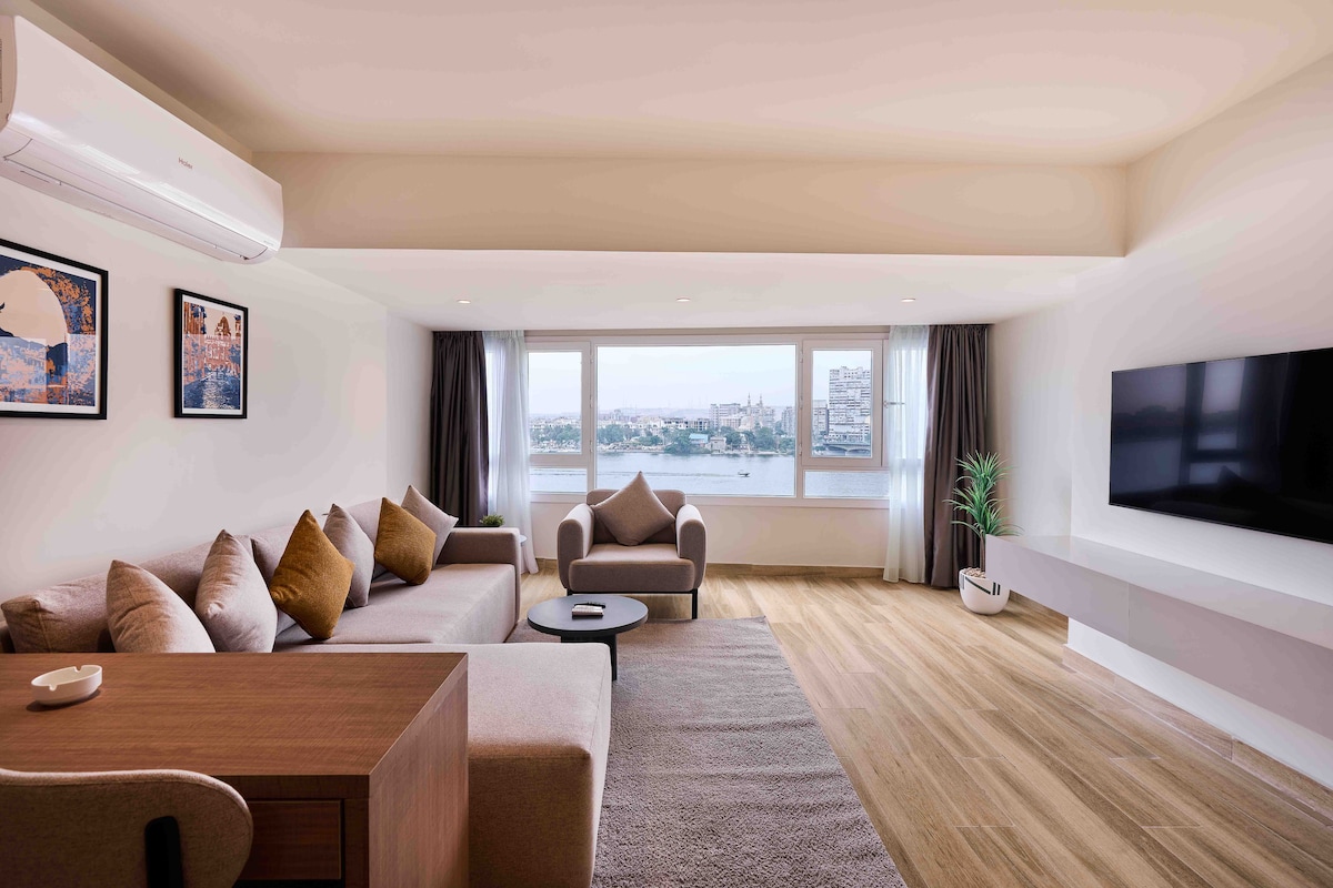 Stay in a breathtaking Nile River view studio in the heart of Egypt! Panoramic views from floor-to-ceiling windows and a chic, contemporary interior make this the perfect place to relax and unwind. Located near famous attractions such as the Pyramids, Sphinx, and Egyptian Museum and surrounded by top-rated hotels like Four Seasons and Fairmont Nile City. Book now for a luxurious and unforgettable stay.