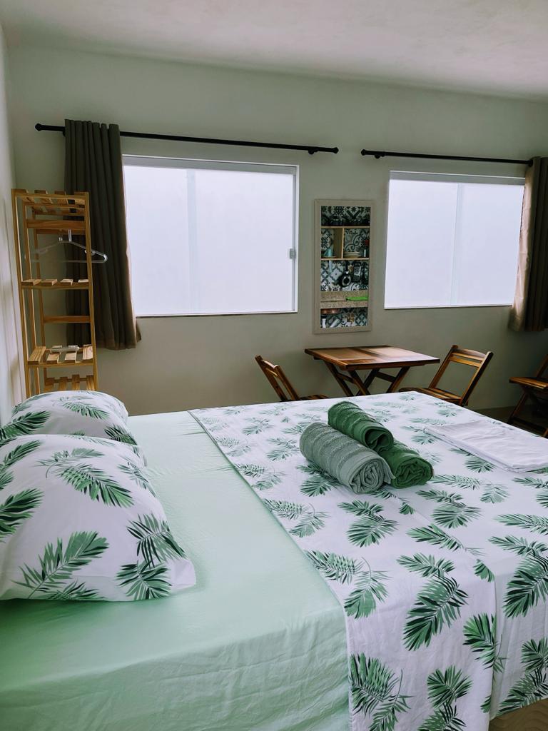 Leia o anúncio antes de fechar. A acomodação fica no 1° andar. Kitnet com ar-condicionado para casal com uma cama Queen alta e confortável da Ortobom. A taxa de limpeza inclui roupas de cama e banho, para trocá-las será cobrada uma nova taxa. Oferecemos utensílios domésticos básicos, pratos, xícara, talheres, micro-ondas, frigobar, sanduicheira, liquidificador. 🚧 Estamos construindo mais acomodações na mesma área das casas, o trabalho acontece de segunda a sexta das 7h às 18h, entrega 12/25