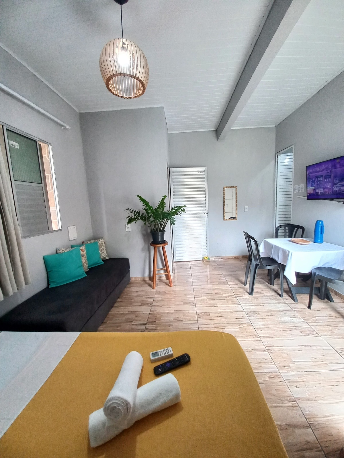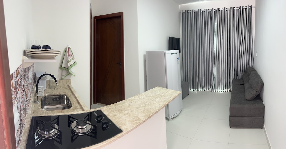 Luminoso mini apartamento, tipo loft, recém construído e decorato (dezembro 2023), totalmente equipado; cozinha completa, cama queen-size, sofá cama, Smart TV 43`, ar condicionado, e wi fi. Perfeito para quem curte vida de praia, localizado na terceira praia a 1 minuto do mar, é o lugar certo para ficar em Morro; perto de supermercados, bares, restaurantes e ao agito da segunda praia, mas num lugar tranquilo para descansar.